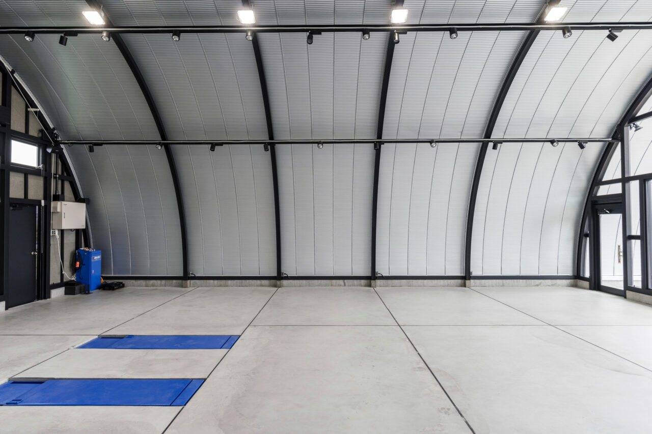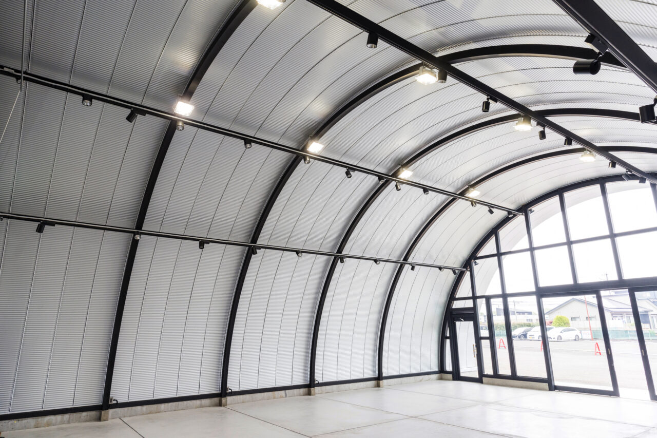 【内観】岐阜県 株式会社 Ecosonic 間口10m 奥行き14.4m 最高高さ5.3m 柱なしの大空間 スチールアーチ