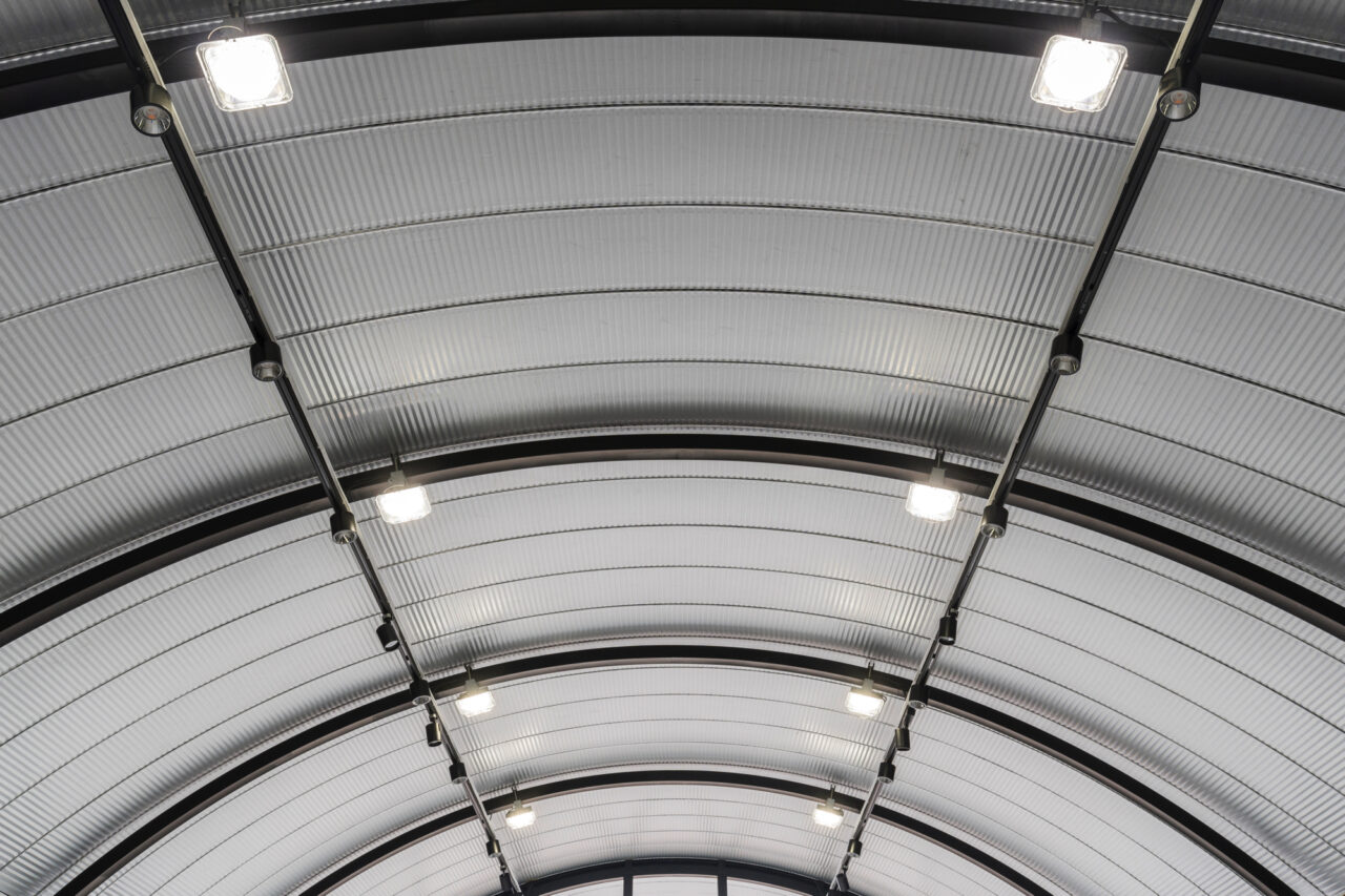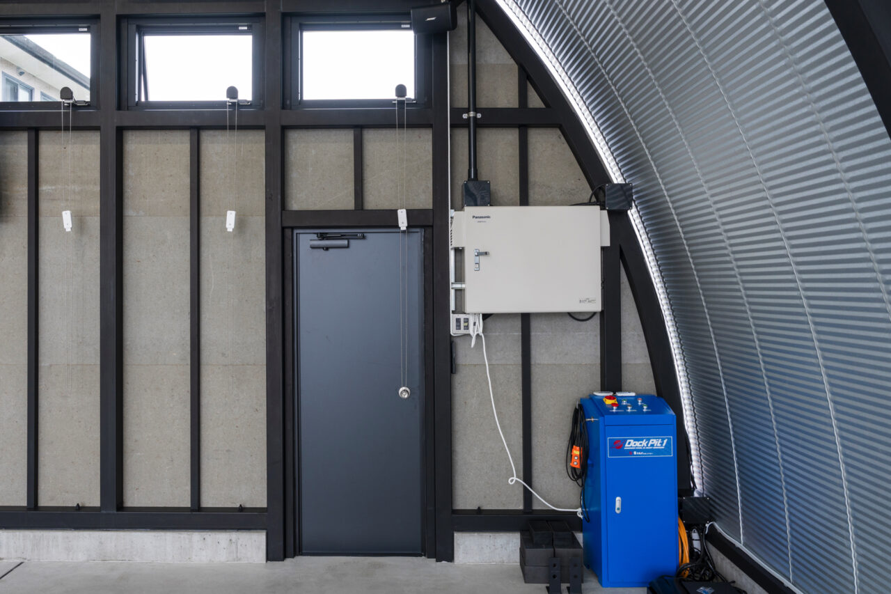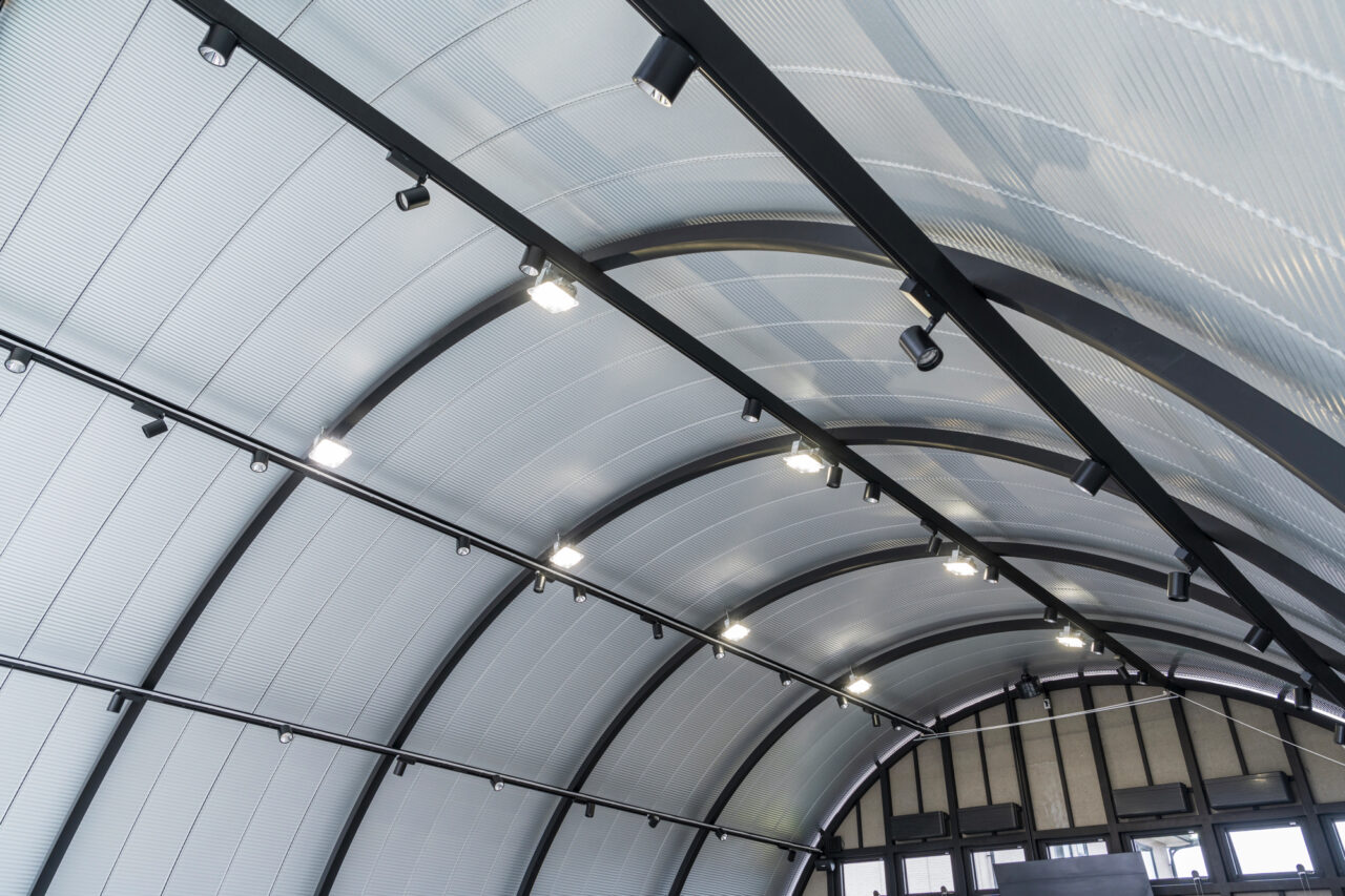 内装の柱は、後に設置予定の棚の下地になり、スチールアーチ躯体には柱は不要となります。
