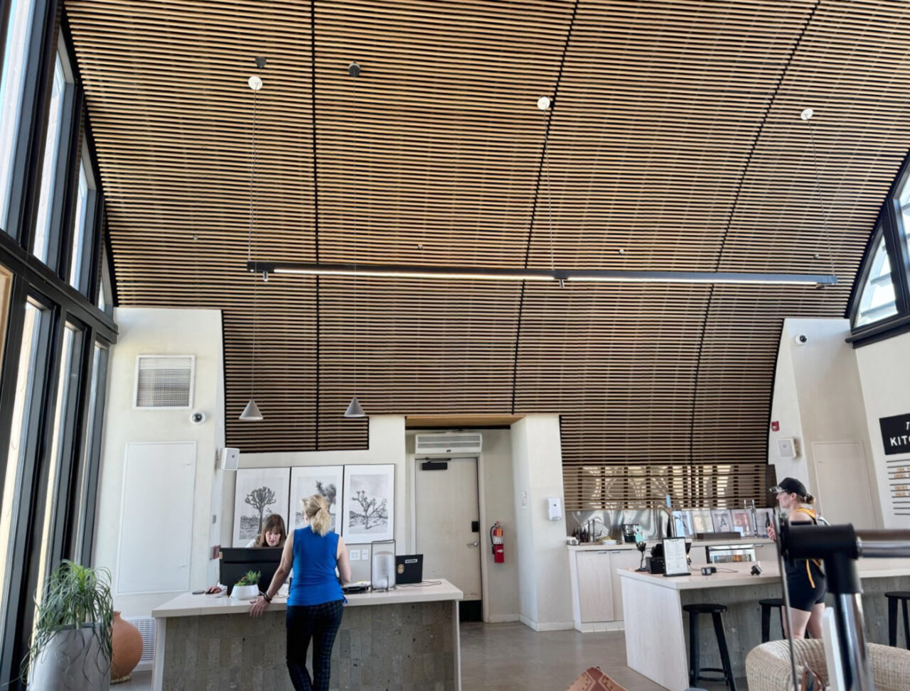 スチールアーチと同様のアーチ形状で、オートキャンプ場の中にある管理棟兼カフェが建設されています。