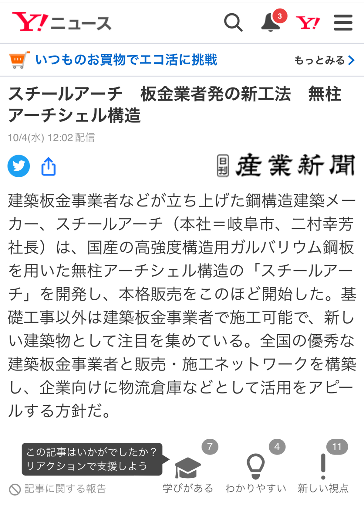 STEEL ARCH YAHOO!ニュース 掲載 2023.10.04 - Wed スチールアーチの日々 STEEL ARCH YAHOO!ニュース 掲載 YAHOO!ニュースにも日刊産業新聞にてスチールアーチ記事掲載いただきました。 ありがとうございました。 実物のSTEEL ARCH見学可能です! お気軽にお問い合わせください。 STEEL ARCH|スチールアーチ お問い合わせはこちら お問い合わせ内容* 最寄りの認定メンバー紹介希望 代理店加入について その他 *お問い合わせ内容をご記入ください。 貴社名 お名前* フリガナ* ご住所* 〒 住所 番地 電話番号* メールアドレス* 入力内容を確認する