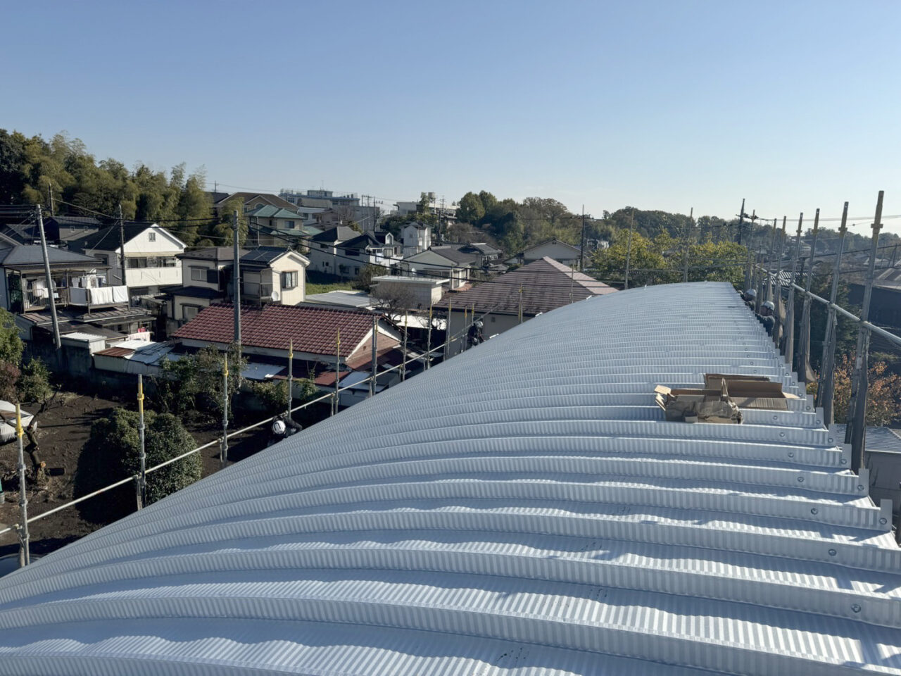 東京都羽村市にてスチールアーチを使用した屋根工事が進行中です。