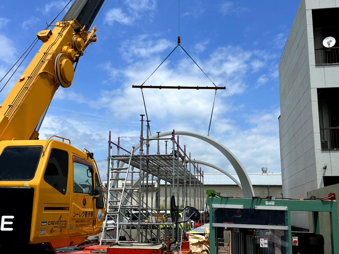 三重県津市にて、間口7.5m 奥行13.02m スチールアーチ、建て方完了しました!