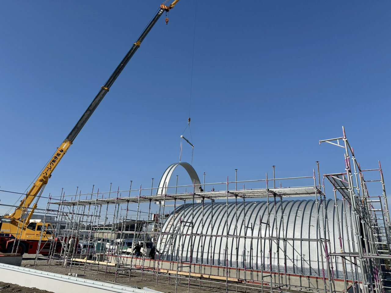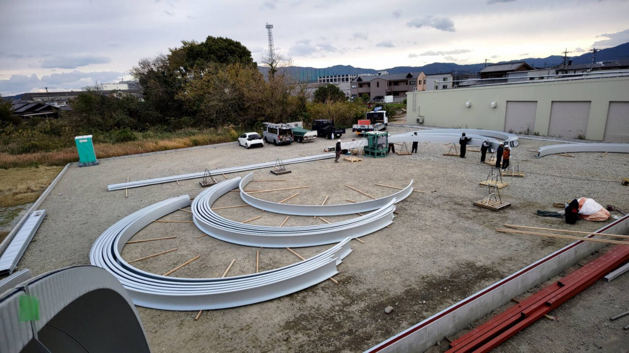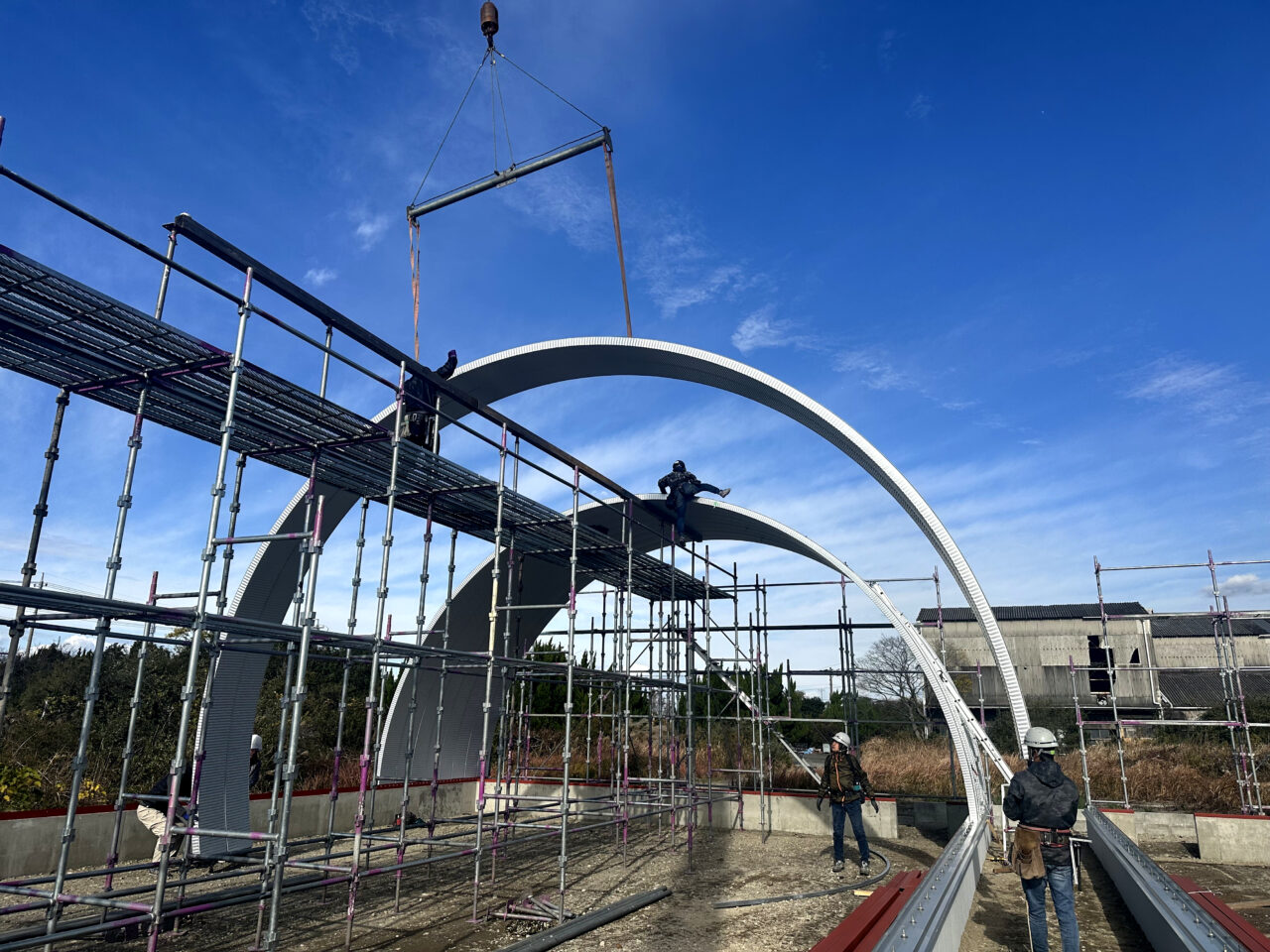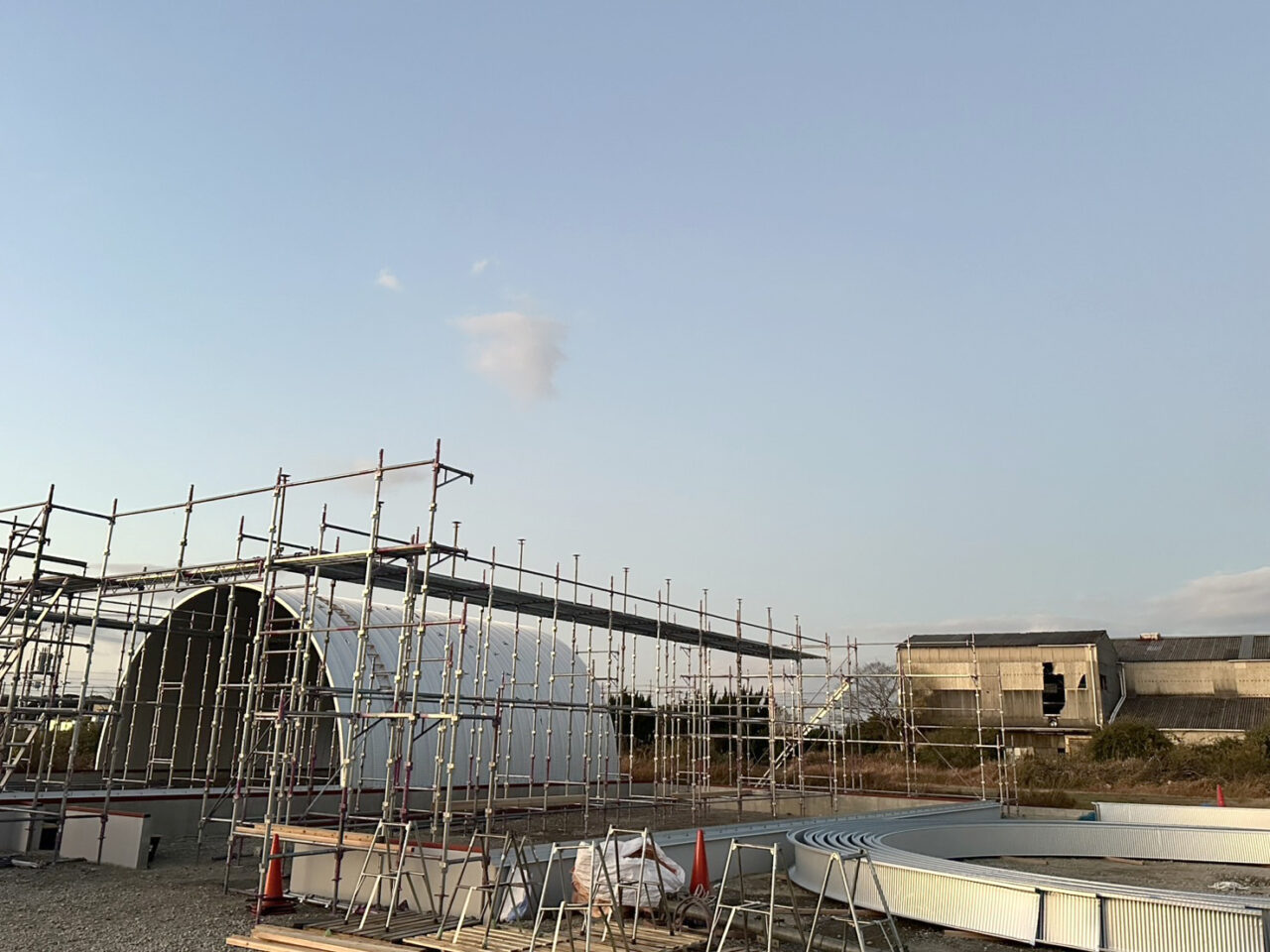現場一次成型・足場設置・土台アングルも設置が完了し、いよいよ最大サイズ2棟の建て方を施工いたしました!