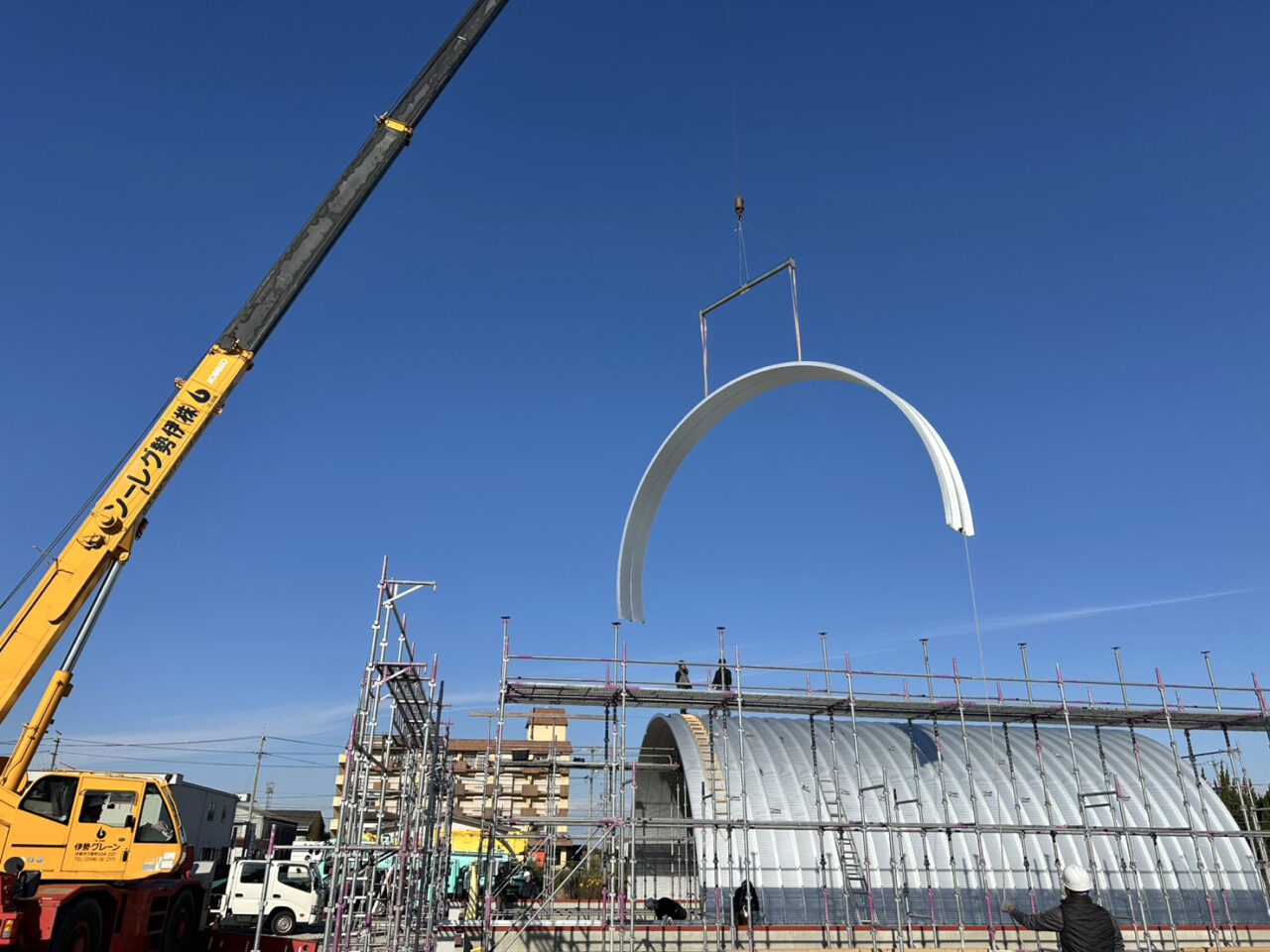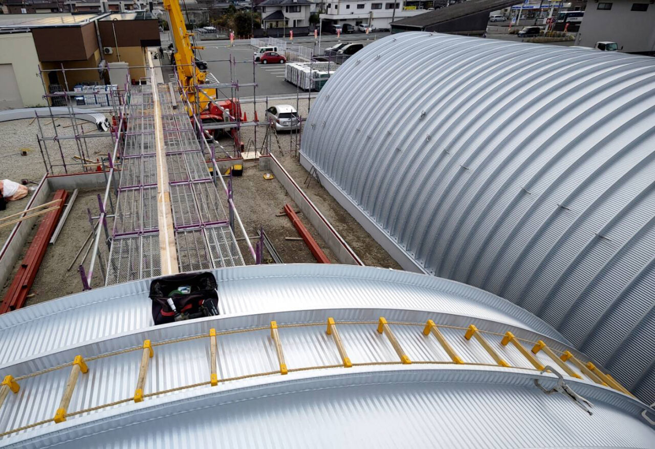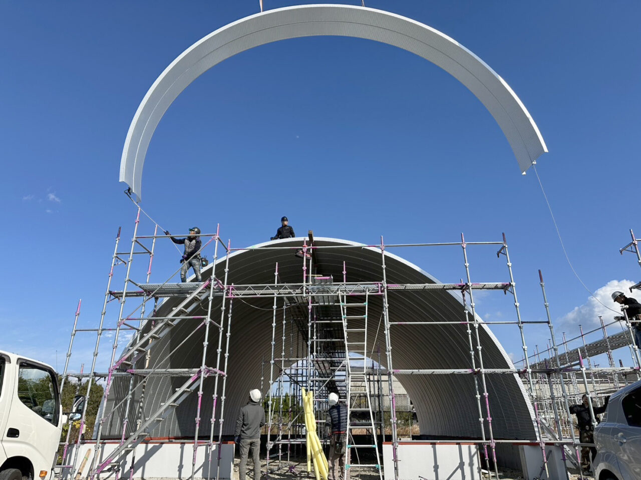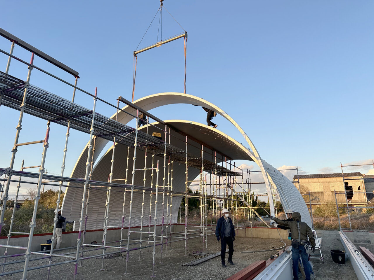 現場一次成型・足場設置・土台アングルも設置が完了し、いよいよ最大サイズ2棟の建て方を施工いたしました!