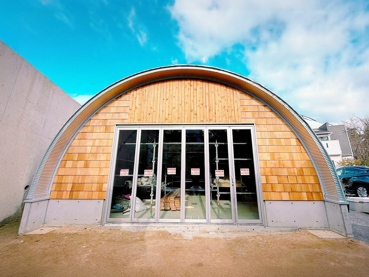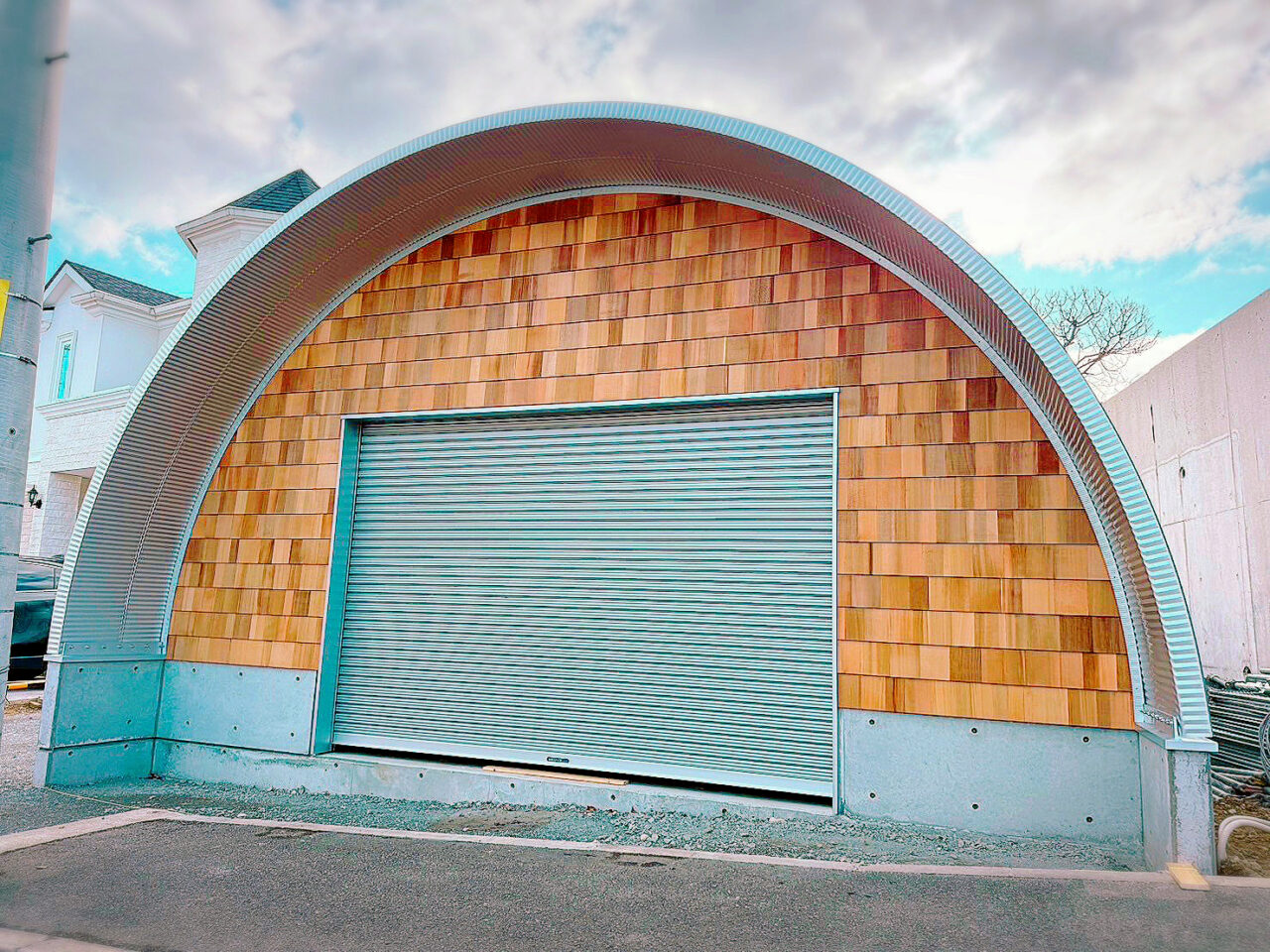 大阪府高槻市 倉庫兼ガレージ建設 妻面「木」仕上げ! スチールアーチ TAKATSUKI BASE