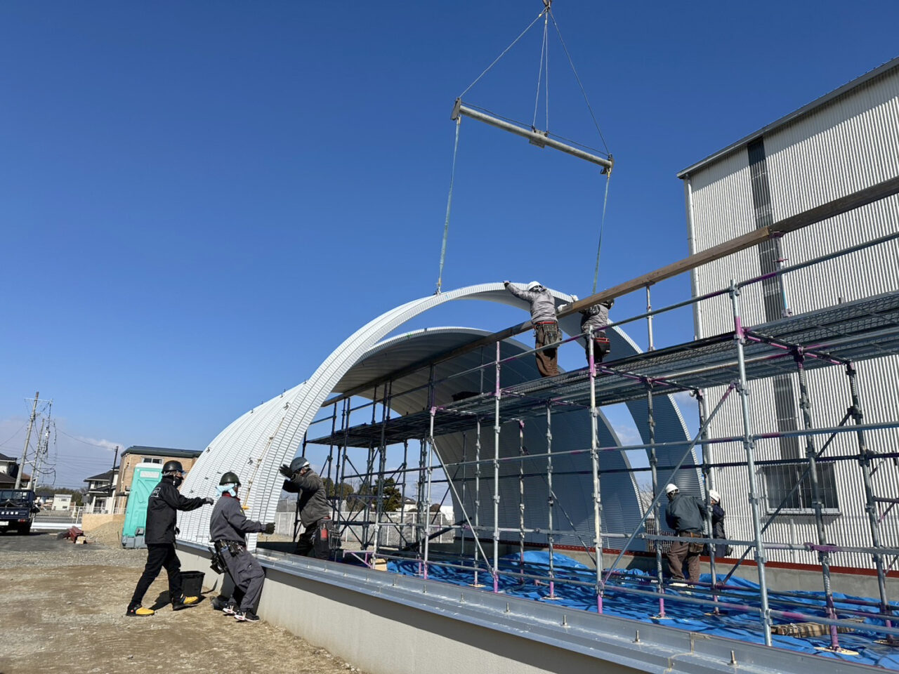 三重県松阪市 倉庫スペース&事務所 奥行き23.25m スチールアーチ建て方!
