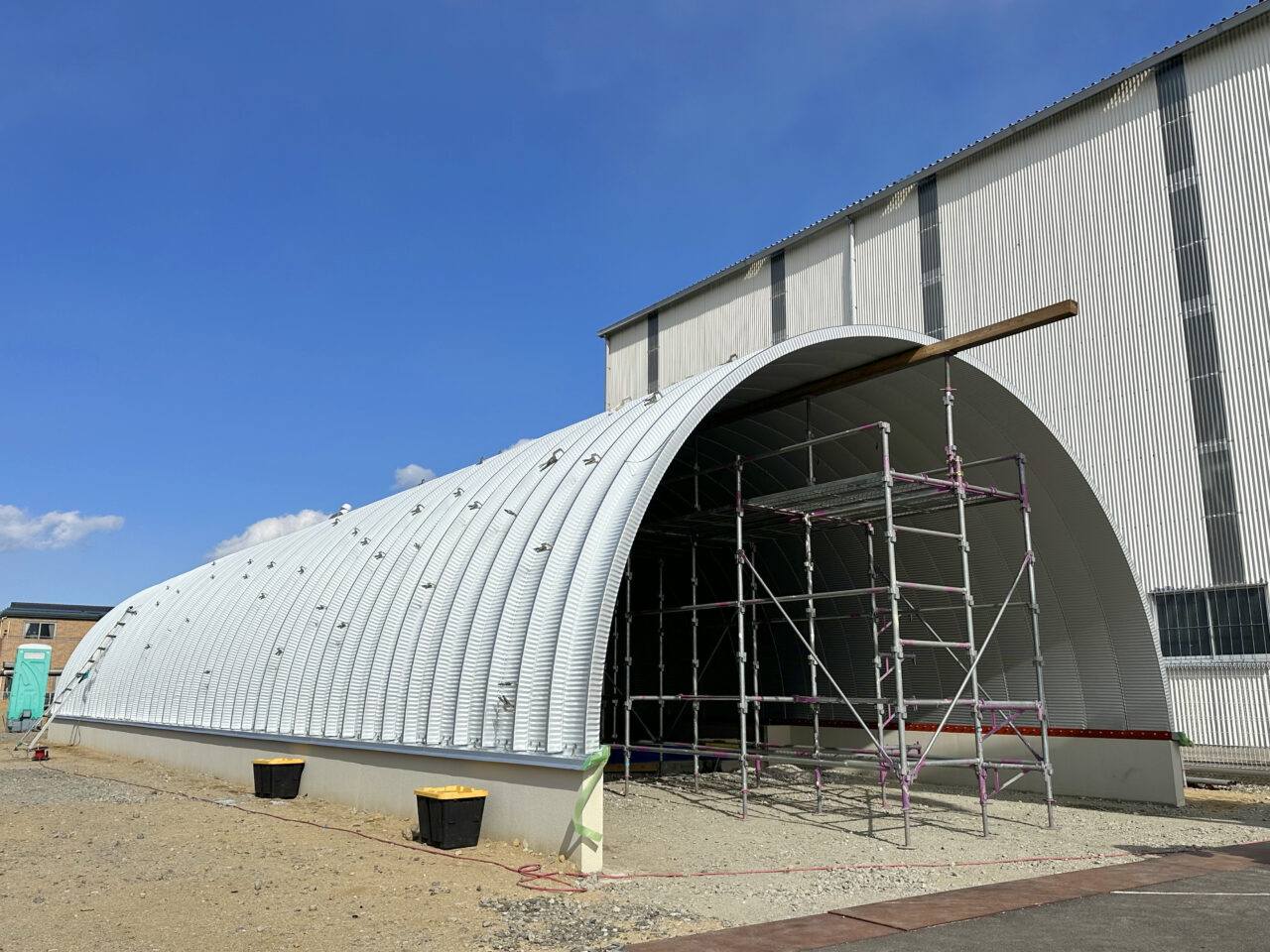 三重県松阪市 倉庫スペース&事務所 最多50スパン 奥行き23.25m スチールアーチ建て方完成!