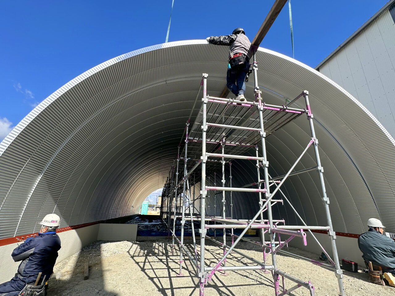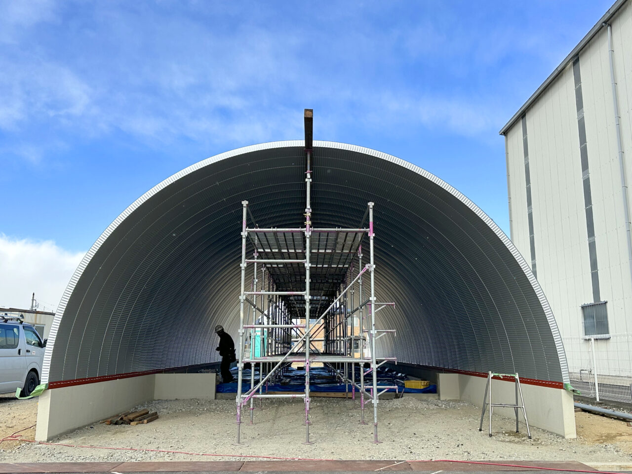 三重県松阪市 倉庫スペース&事務所 最多50スパン 奥行き23.25m スチールアーチ建て方完成!