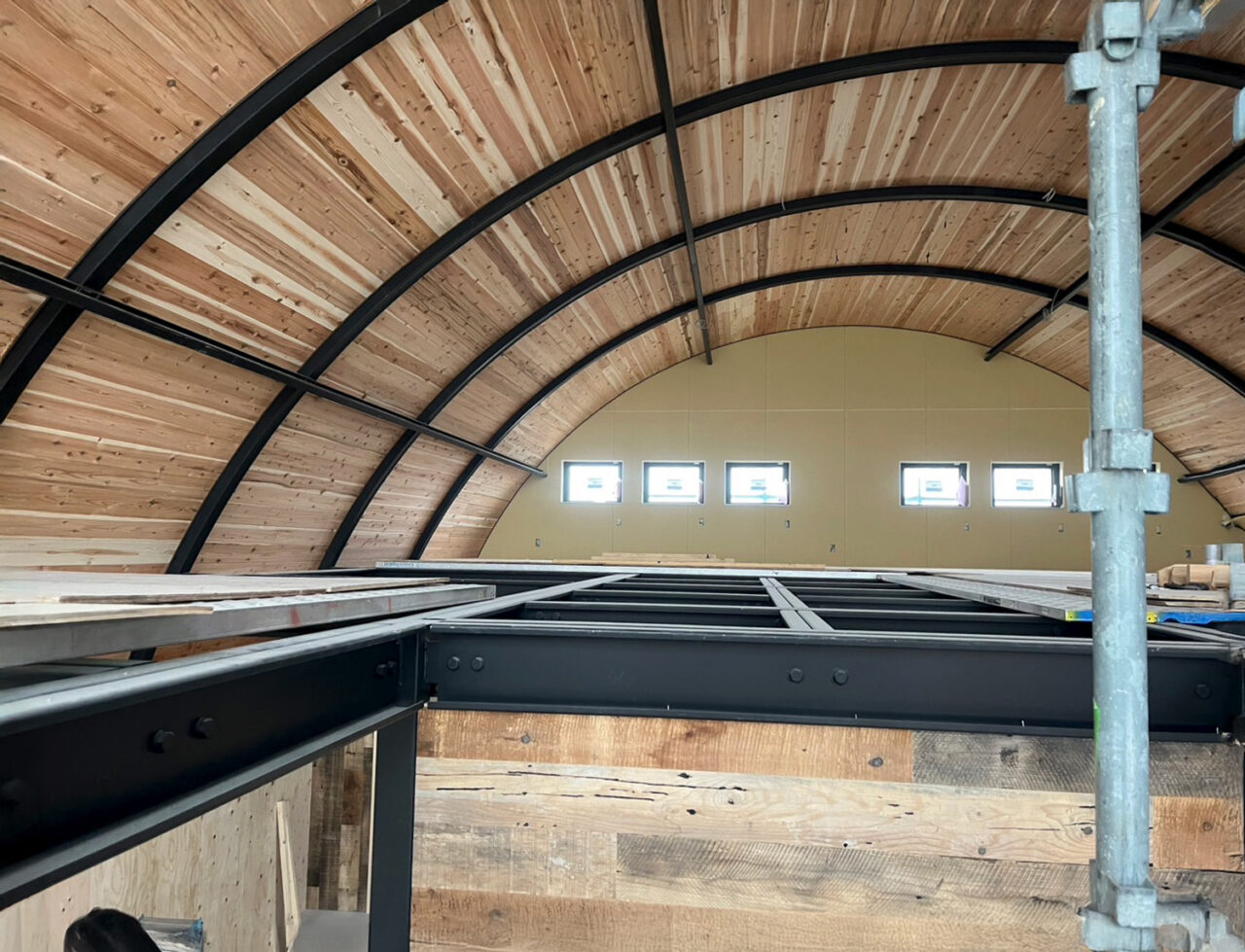 今回施工中のスチールアーチも、企業事務所としての利用を目的としつつ、広々とした空間を実現するために設計されています。