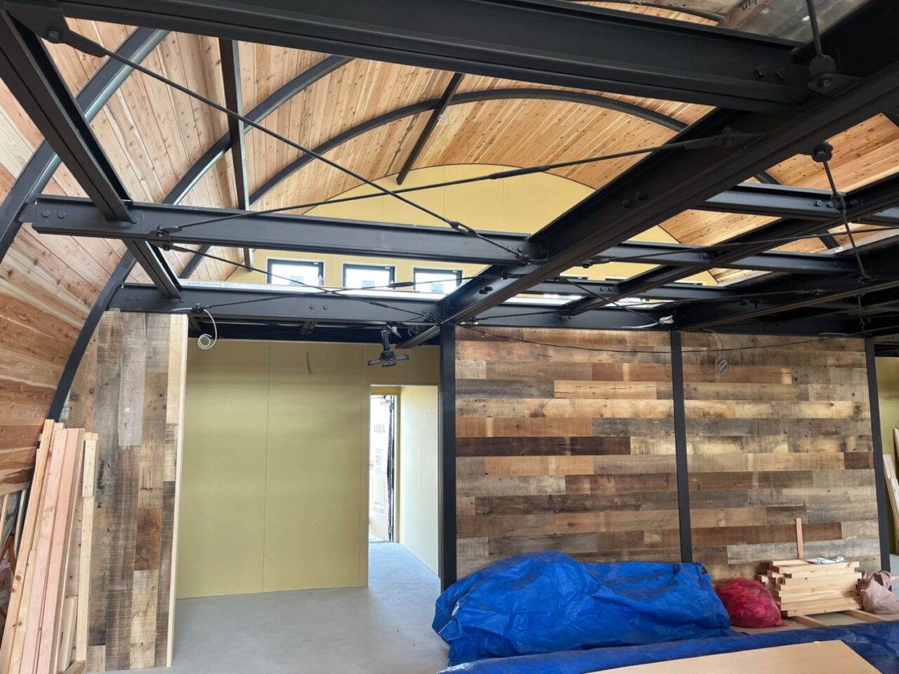 スチールアーチの無機質なデザインに対し、内装には木材を使用することで、温もりのある居心地の良い空間に仕上げます。