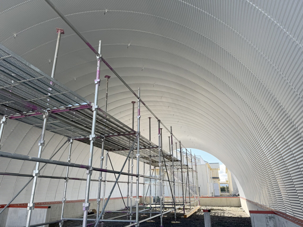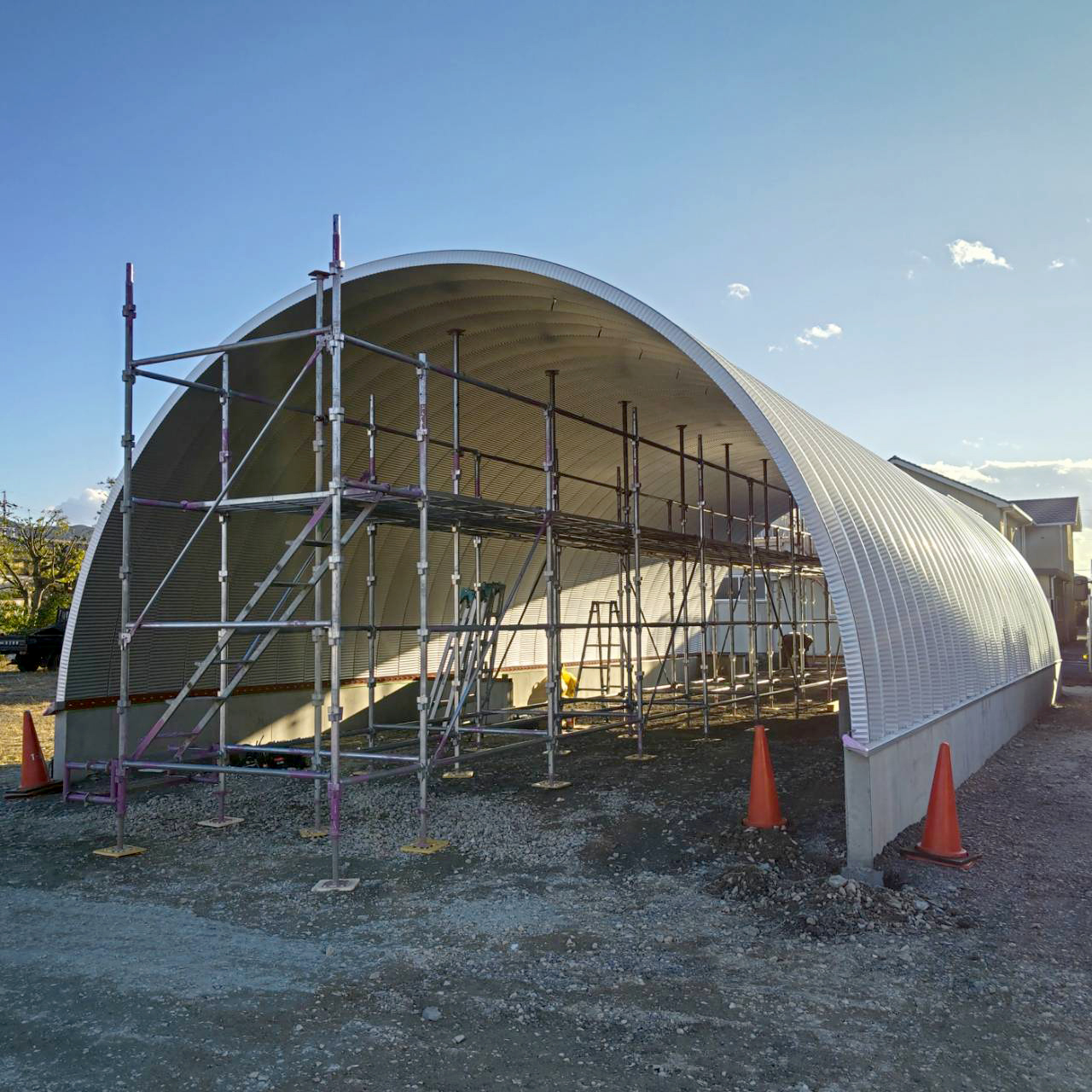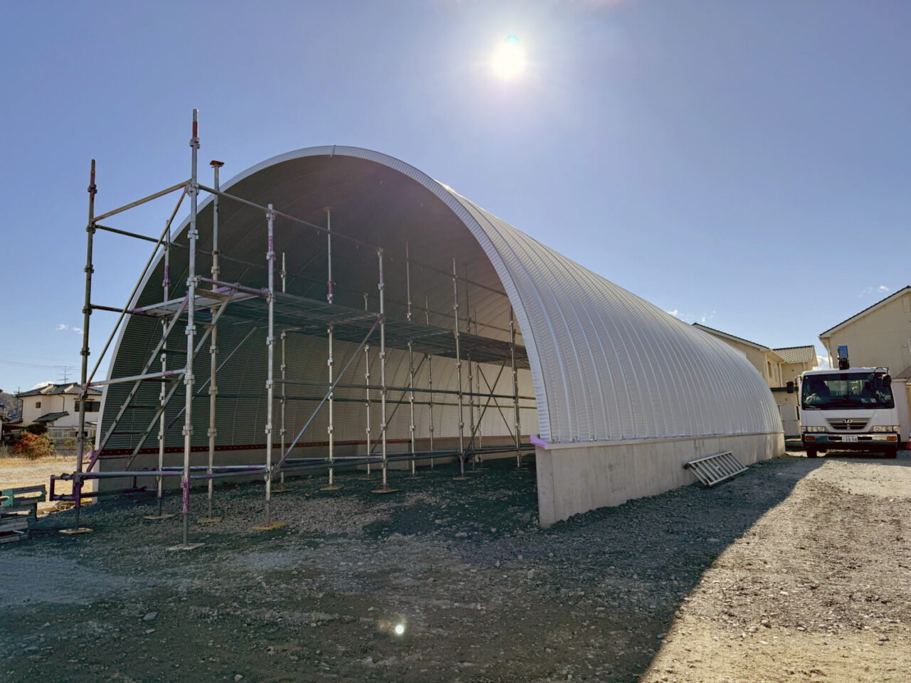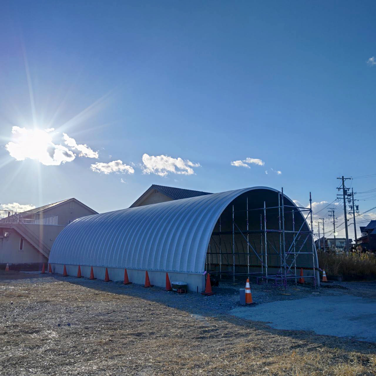 三重県 有限会社 谷口板金工業 スチールアーチ 建て方完了! 柱なしの36スパン 16.74mの奥行き!
