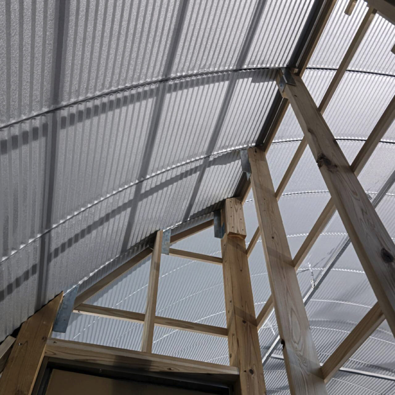 三重県 有限会社 谷口板金工業 奥行き16.74m柱なしの大空間 妻面下地完了!